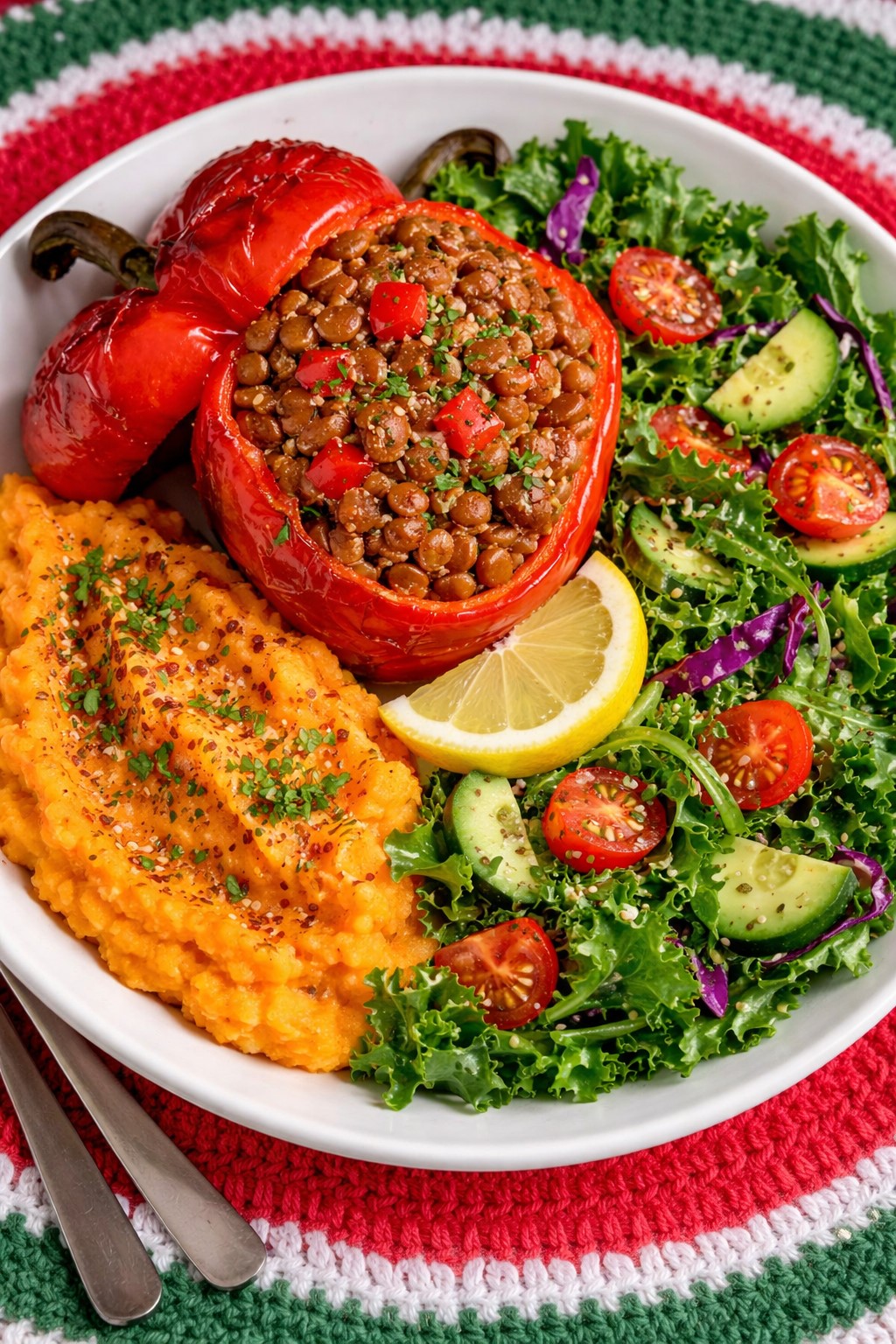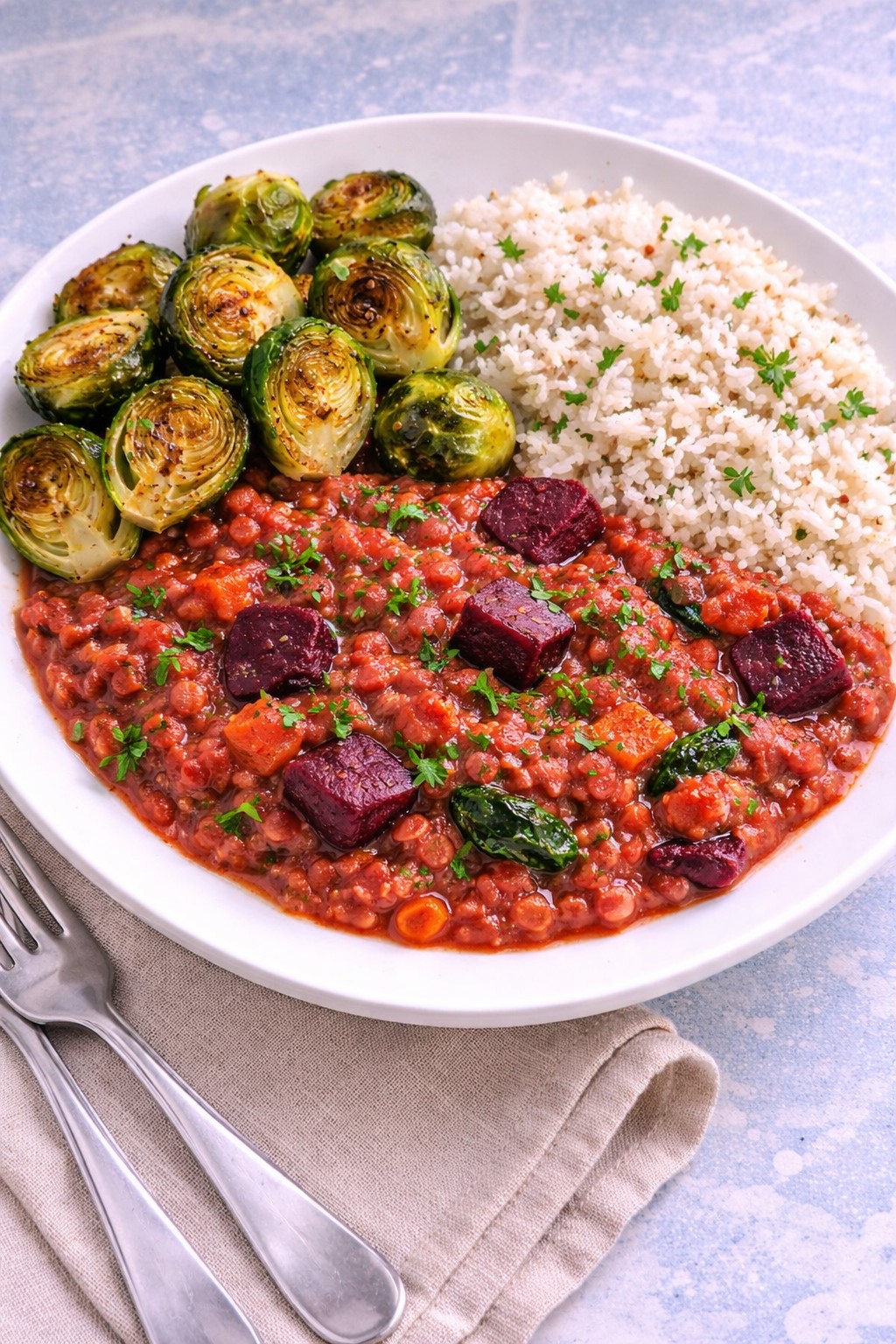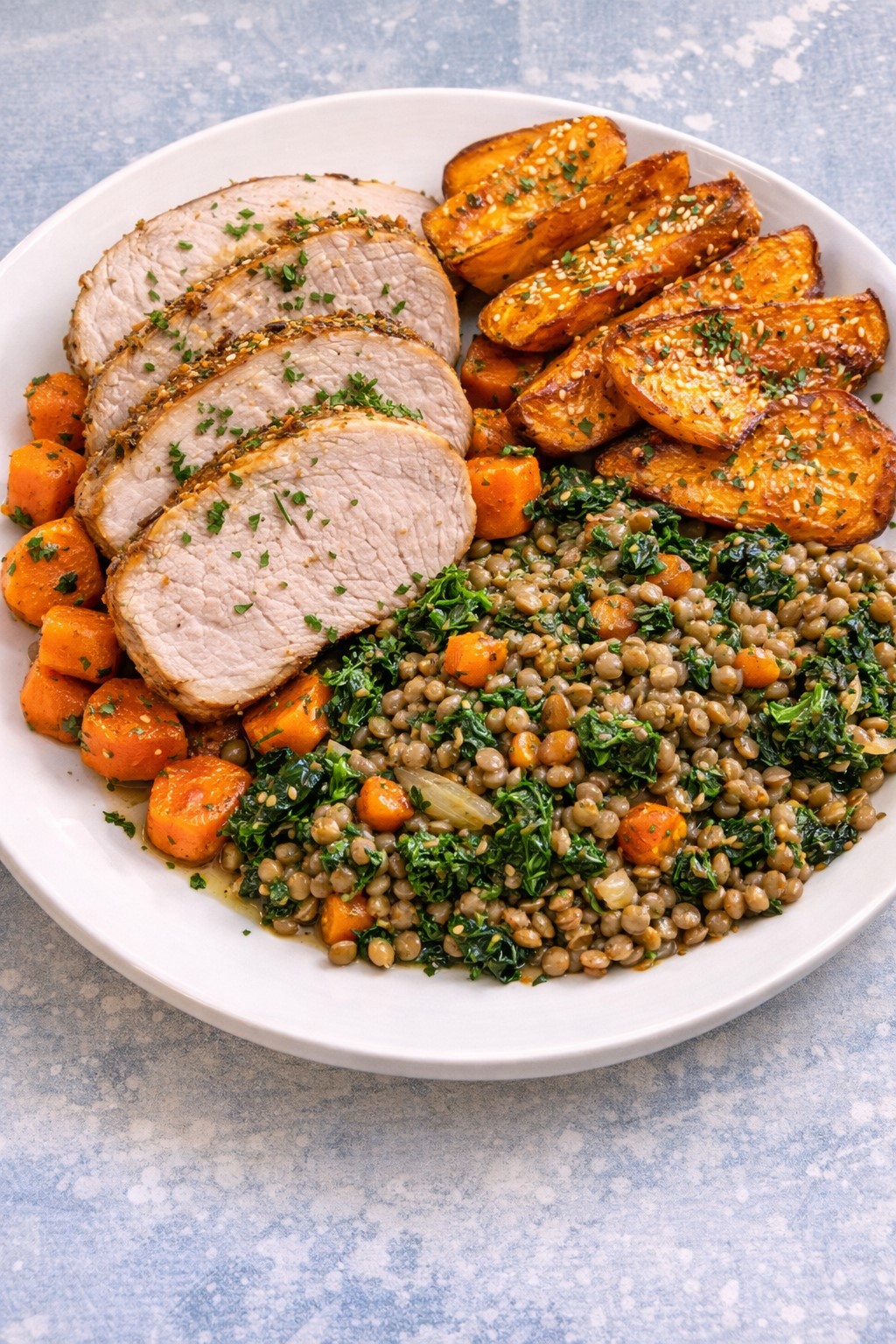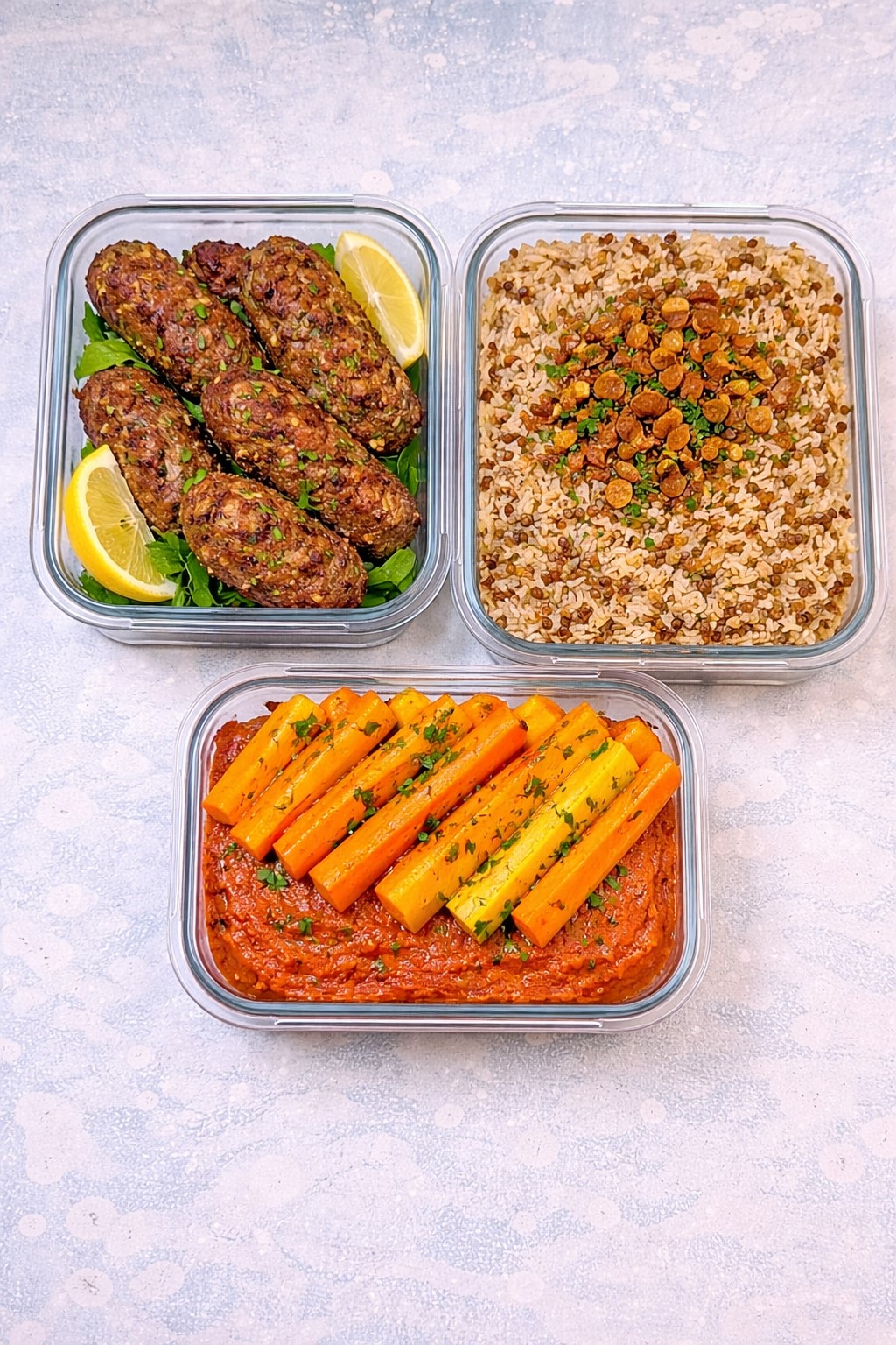 All meals are approximately 500g per portion and structured with vegetables, grains or roots, and legumes.
