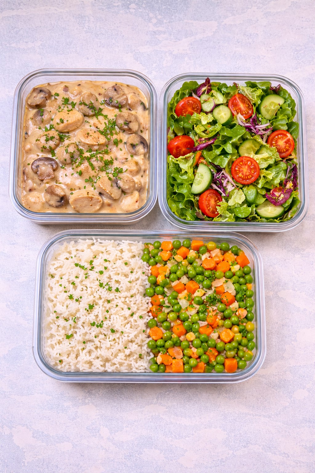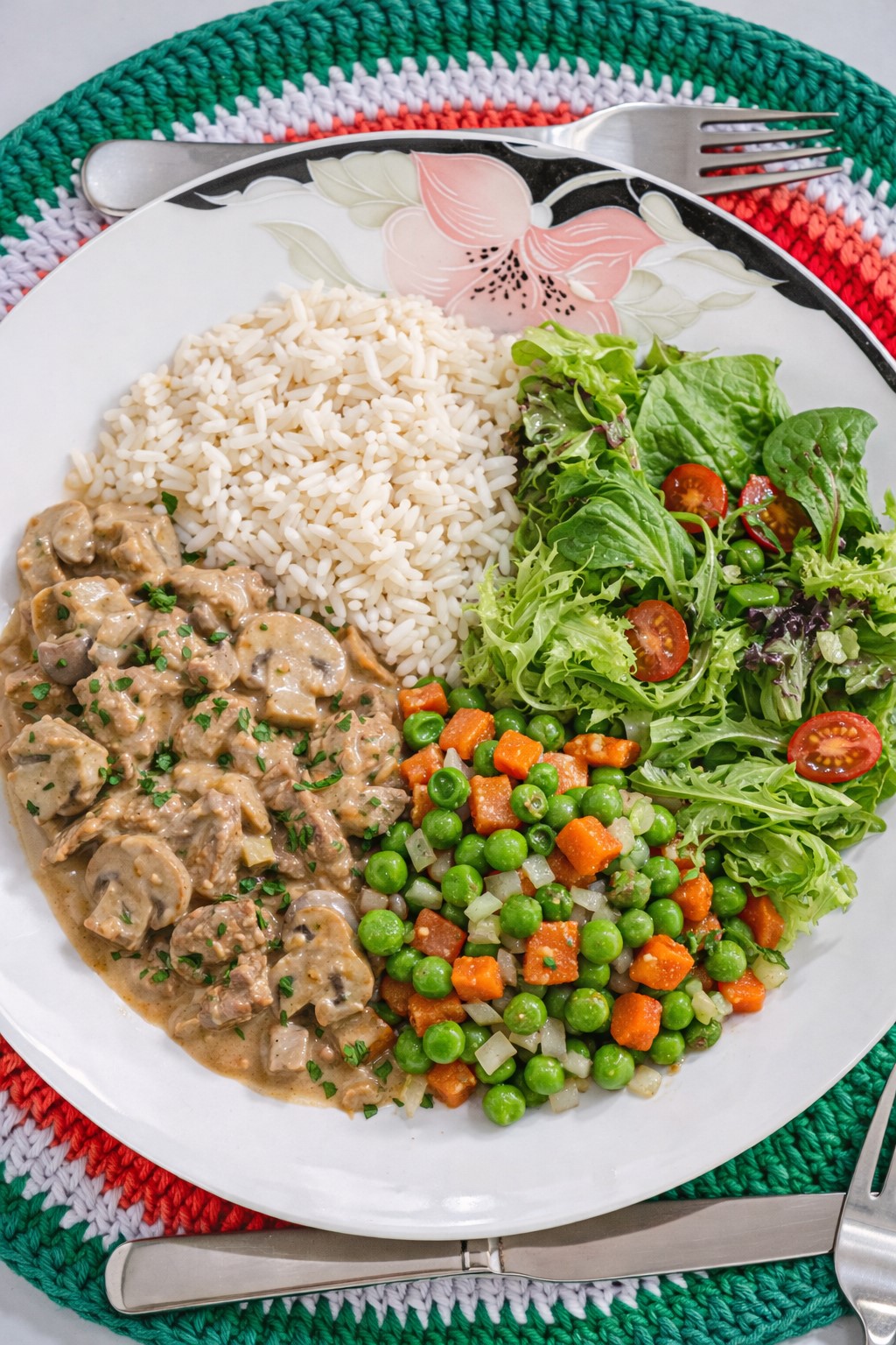 Chicken Stroganoff with mushrooms (light cream), Rice, Peas, carrots and onions & green salad