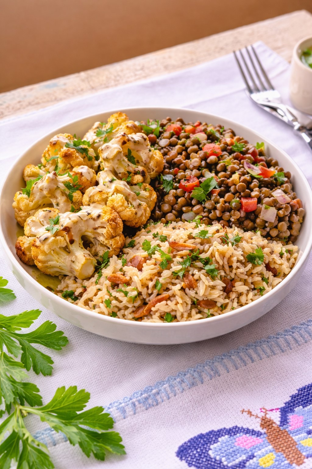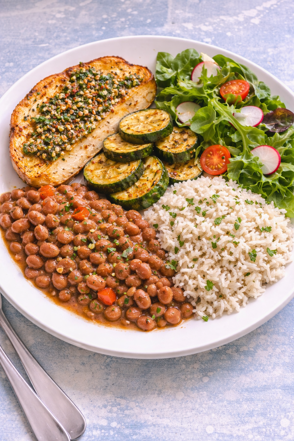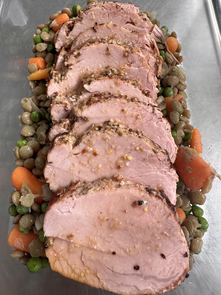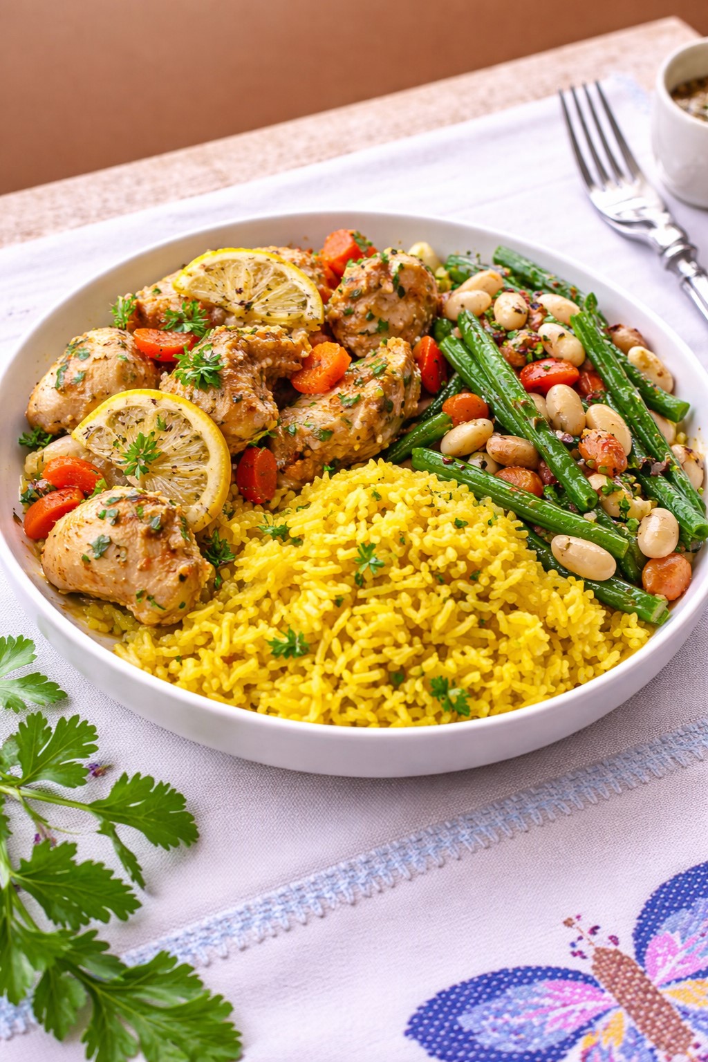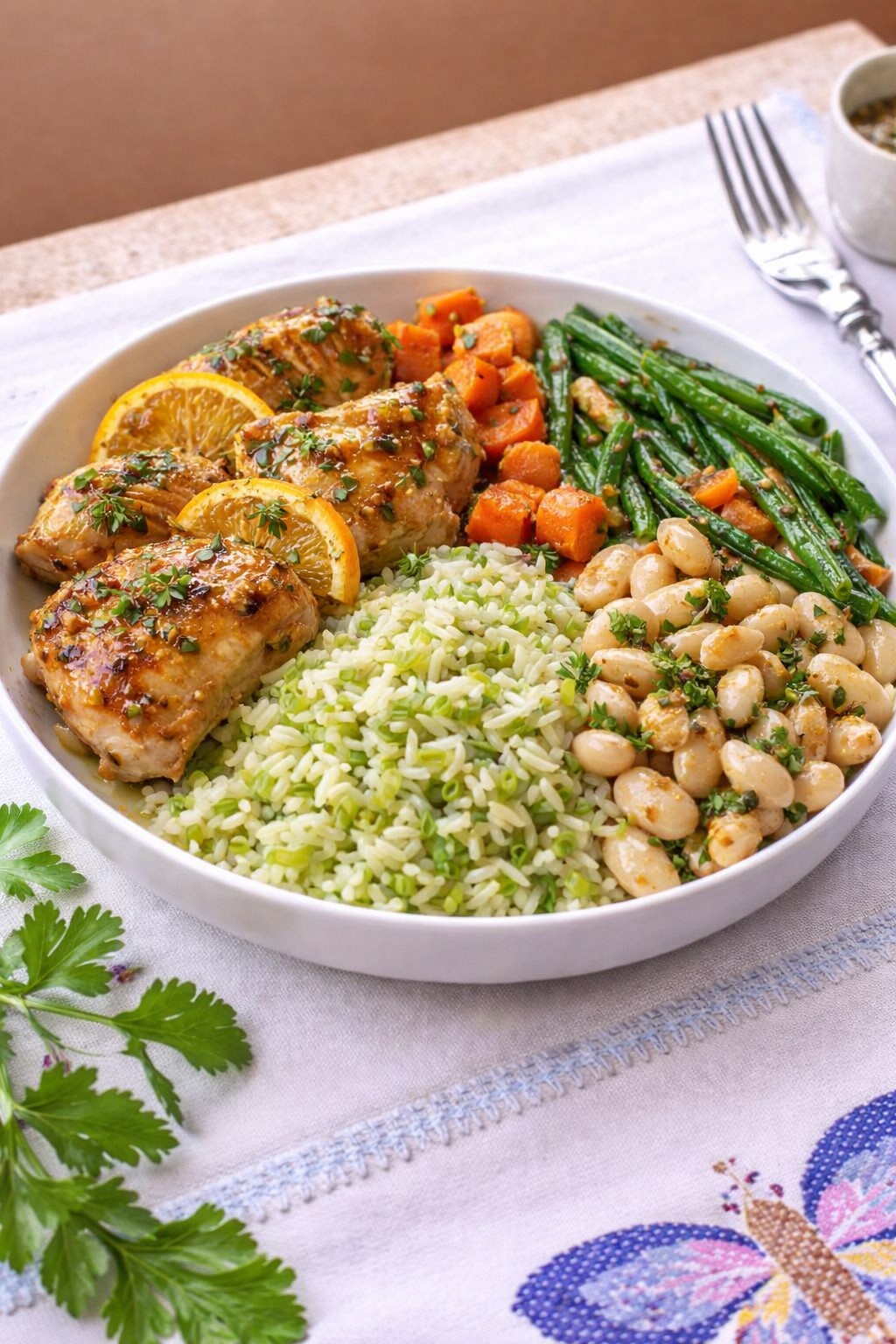 Roasted chicken with orange and thyme, served with leek rice, creamy white beans, roasted carrots, and green beans.